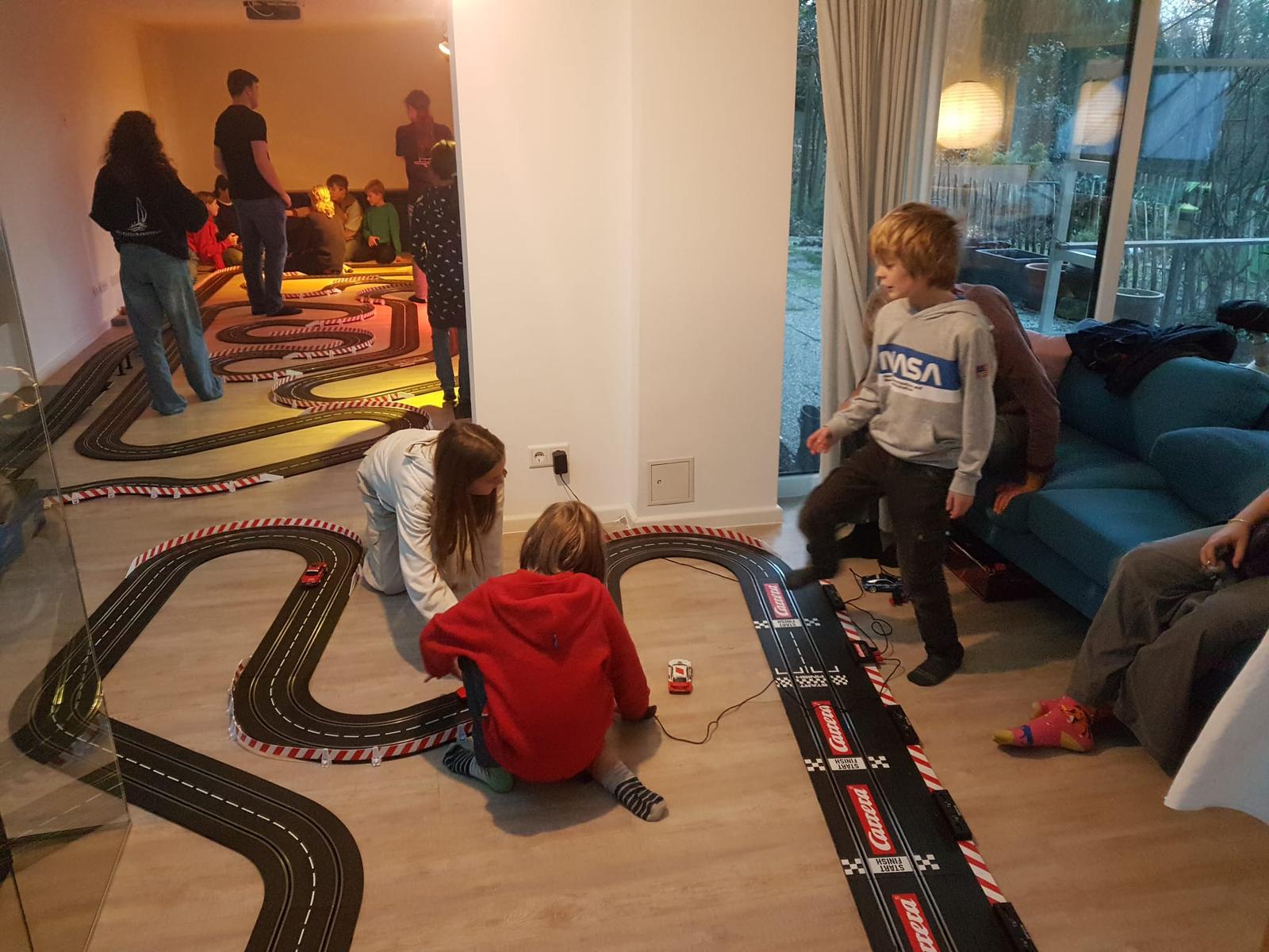 In einem großen Kellerraum passt die Carrerabahn gut hinein. Gemeinsam aufgebaut und schon ging das Rennen los. Das hat richtig viel Spaß gemacht.